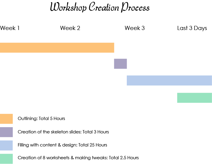 1. Timeline – I had about 3.5 weeks to create a workshop starting from coming up with the title and concept to creating worksheets.